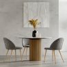 Denne spisestolen er mye mer enn bare en sitteplass; det er en stiluttalelse. Enten det er ved et tradisjonelt spisebord eller i en mer moderne setting, integrerer denne stolen seg sømløst og tilfører en touch av nordisk forfining. Denne stolen er polstret i mykt og luksuriøst fløyel, noe som tilfører en touch av sofistikasjon til rommet ditt, enten det er hjemme eller på et luksushotell, en designerrestaurant eller et venterom. Metallbenene med sin naturlige tre-look-finish gir stolen et varmt og jordnært element, som harmonisk kontrasterer med fløyelen og skaper en balansert estetikk.